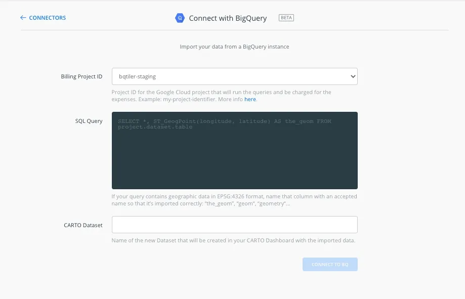 We can go to our configured URL and use the login credentials to access CARTO Builder. Once in the Dashboard you can click on “New Dataset” and find the activated BigQuery connector. Click on it and find the connection options below: