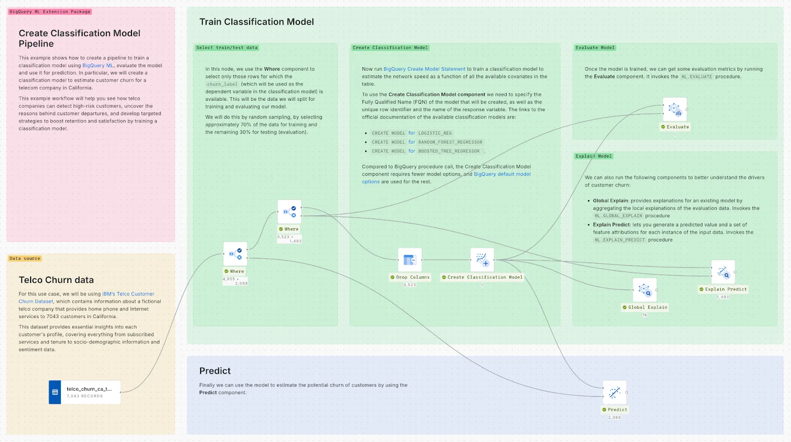 [](/cdn.prod.website-files.com/6345207a1b18e581fcf67604/67a1e00d4c54e6cc26035da8_bigquery%20ml%20source%20data%20map.webp) Now, it is time to create our first workflow using the BigQuery ML Extension! We will [load the telco dataset](https://docs.carto.com/carto-user-manual/data-explorer/importing-data) into our data warehouse, from which we’ve pre-selected some interesting features (e.g. those correlated with churn), and we will train a classification model to estimate which customers are prone to churn and which are not. This is the complete workflow, which can be accessed as a [template](https://storage.googleapis.com/carto-workflows-examples/files/bq_ml_create_classification_model.sql) which you can open directly in your workspace [here](https://academy.carto.com/creating-workflows/workflow-templates): Analyzing customer churn with CARTO Workflows First, we use the [Where](https://docs.carto.com/carto-user-manual/workflows/components/data-preparation#where) component to select only those rows for which the churn_label is available. This will be the data we will split for training and evaluating our model through random sampling (RAND() < 0.7) using another [Where](https://docs.carto.com/carto-user-manual/workflows/components/data-preparation#where) component.Secondly, we will use the training data to create a** classification model**, whose output will be the probability of churn (i.e. 0 means no churn, 1 means churn) for a customer given specific socio-demographic, contract type and sentiment characteristics. Simply connect the Create Classification Model component to the input data and set up the model’s parameters. You will need to give the model a Fully Qualified Name (FQN), which is where the model will be stored. In this way, it would also be possible to call the model from a different workflow using the Get Model by Name component.
