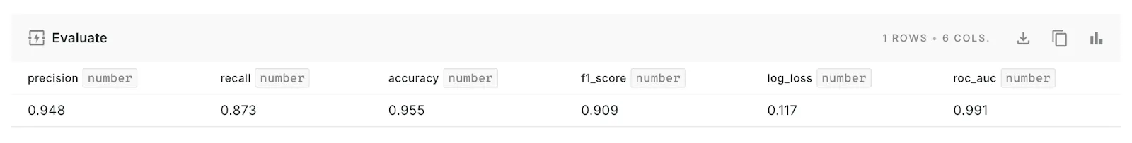 Next, we will [Evaluate](https://docs.carto.com/carto-user-manual/workflows/components/bigquery-ml#evaluate) the performance of our model using the test data. Based on the [classification metrics](https://developers.google.com/machine-learning/crash-course/classification/accuracy-precision-recall) (see below), the results seem very promising. The high** accuracy** indicates that the model correctly predicts the majority of instances, and the low** log loss** suggests that our model's probability estimates are close to the actual values. With** precision** and** recall** both performing well, we can be confident that the model is making correct positive predictions, and the** F1 score** further reassures us that the balance between precision and recall is optimal. Additionally, the** ROC AUC score** shows that our model has a strong ability to distinguish between clients churning and not churning. Overall, these metrics highlight that our model is well-tuned and capable of handling the classification task effectively. The classification metrics Having a model that performs good, we can then run predictions and obtain estimates to check which customers are prone to churn. We will use the [Predict](https://docs.carto.com/carto-user-manual/workflows/components/bigquery-ml#predict) component to do so.Lastly, to better understand our model, we can take a look at the model’s explainability. This gives an estimate of each feature’s importance when it comes to churn. The Global Explain component provides the feature importance of the model predictors to each class (churn vs no churn). If the Class level explain option is not clicked, the overall feature importances are given, rather than per class. For further details, we can also use the Explain Predict component, that provides feature attributions that indicate how much each feature in your model contributed to the final prediction for each given customer.