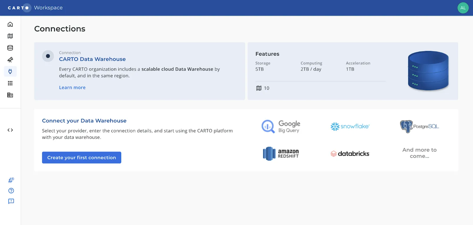Not a problem! Every CARTO user is provided with access to the CARTO Data Warehouse connection. This will grant you access to both a private and organisation-wide cloud storage and computing space, the amount of which will depend on your subscription plan. You can also import data from URLs or local files into this location, as well as access a range of demo tables and tile sets to work with.