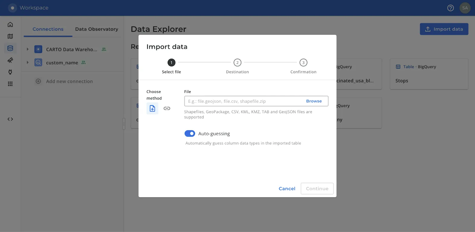 You can also use the CARTO UI to import spatial data directly to your data warehouse. From theData Exploreryou can find theImportwizard to the top right of the Data Explorer window (see below).