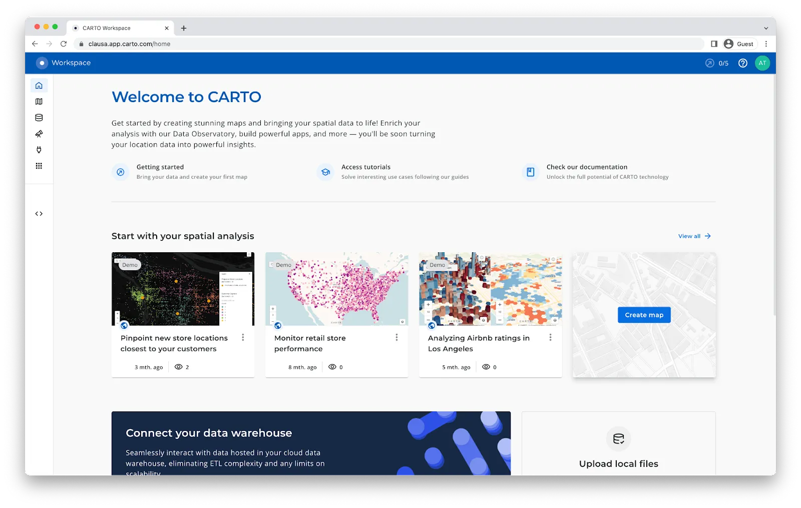 Once set up, head to app.carto.com and login. You should see a window that looks a little something like the one below. This is your CARTO Workspace and will be the hub for all things CARTO. No software download, no slow install - just login and go! While you’re onboarding, from the workspace home you’ll be able to follow the Getting startedsteps (beneath “Welcome to CARTO”) to help you get used to the CARTO platform.