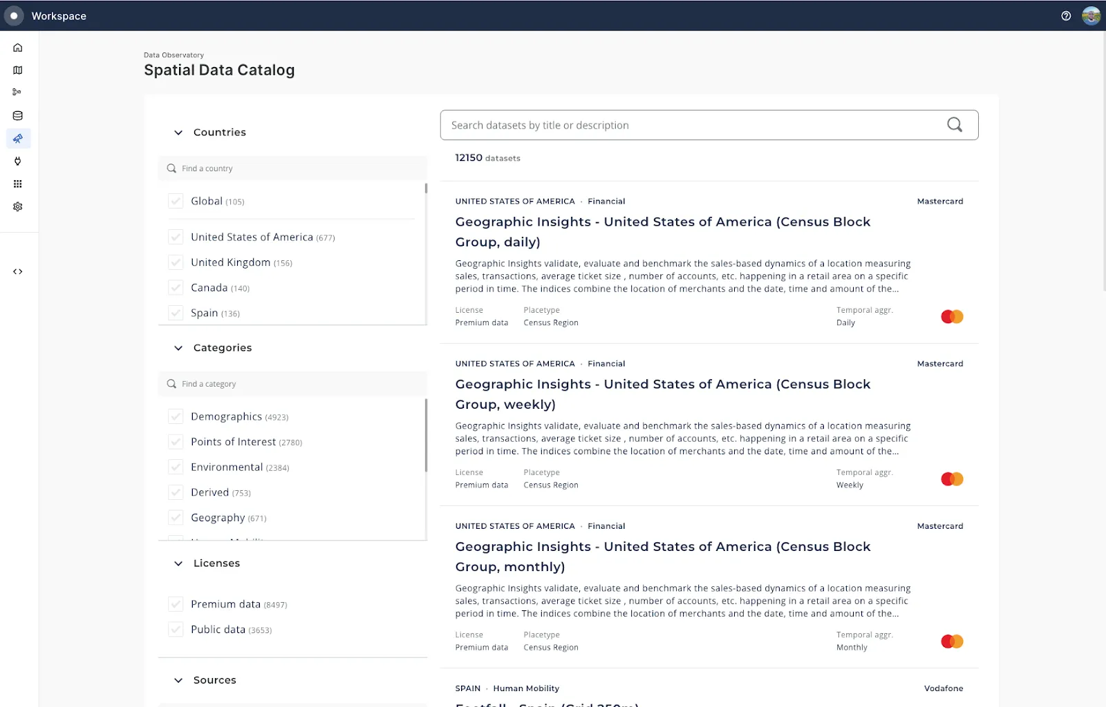 Ever heard the statistic that most people working with data spend 60-80% of their time cleaning, formatting and ETL-ing that data? We’re trying to take some of the pain out of that process with our Spatial Data Catalog. From here, you can subscribe to over 12,000 different spatial datasets from around the world, ranging from geographic boundaries to consumer spend data.