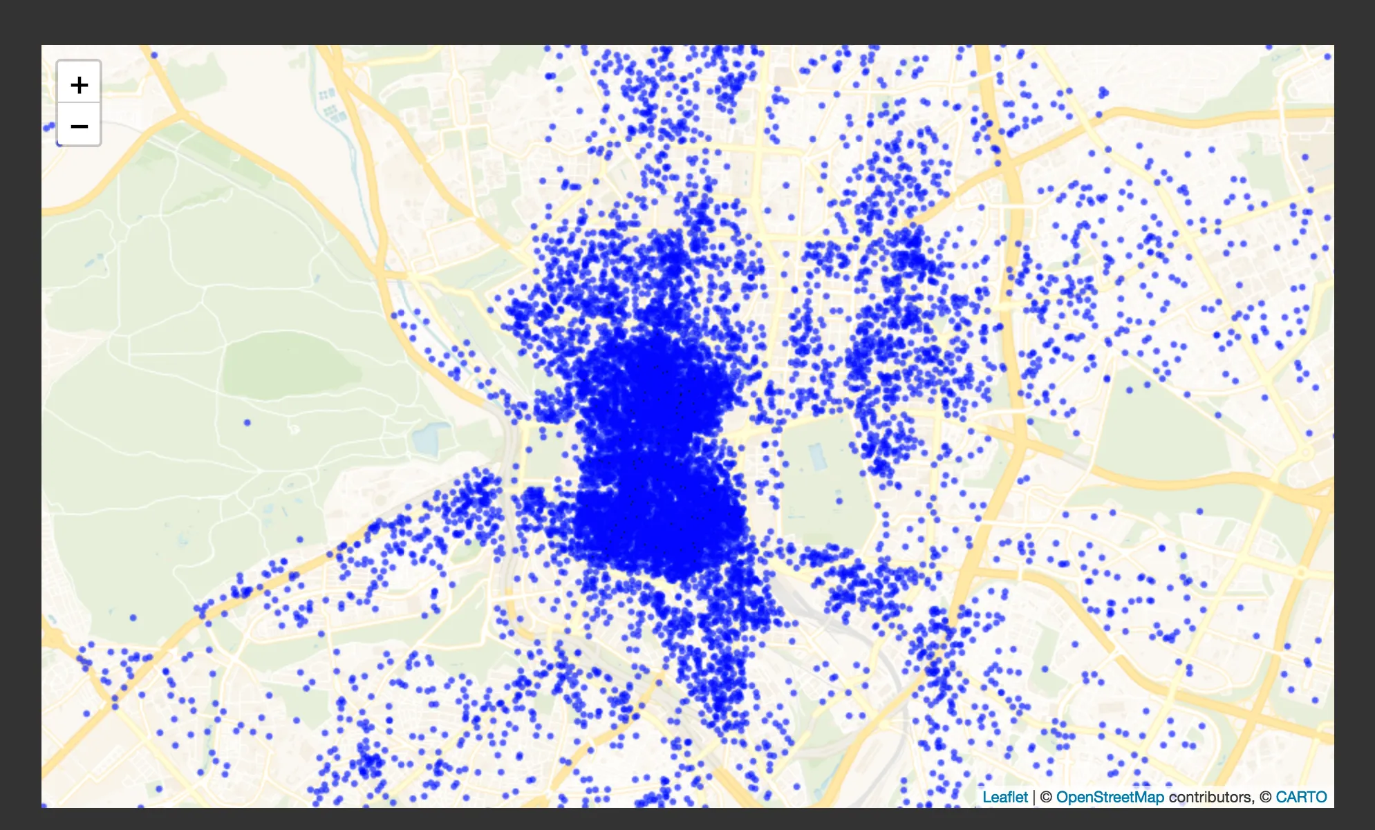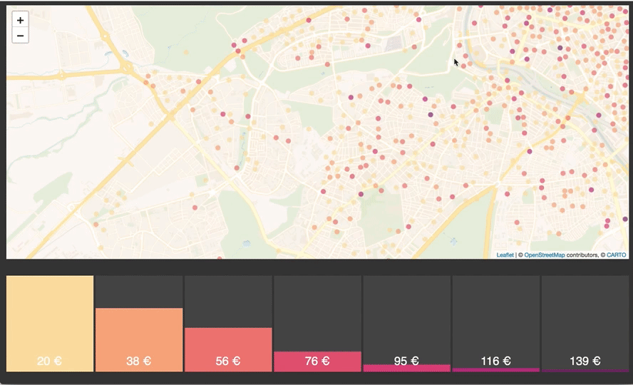 This proof of concept is a map showing prices of AirBNB rentals per night in the city of Madrid. Using CARTO.js we divide the apartments into seven categories according to their price assigning one color per category. In addition we create a dynamic histogram that indicates how many apartments belong to each category in the area of the map we are looking at.