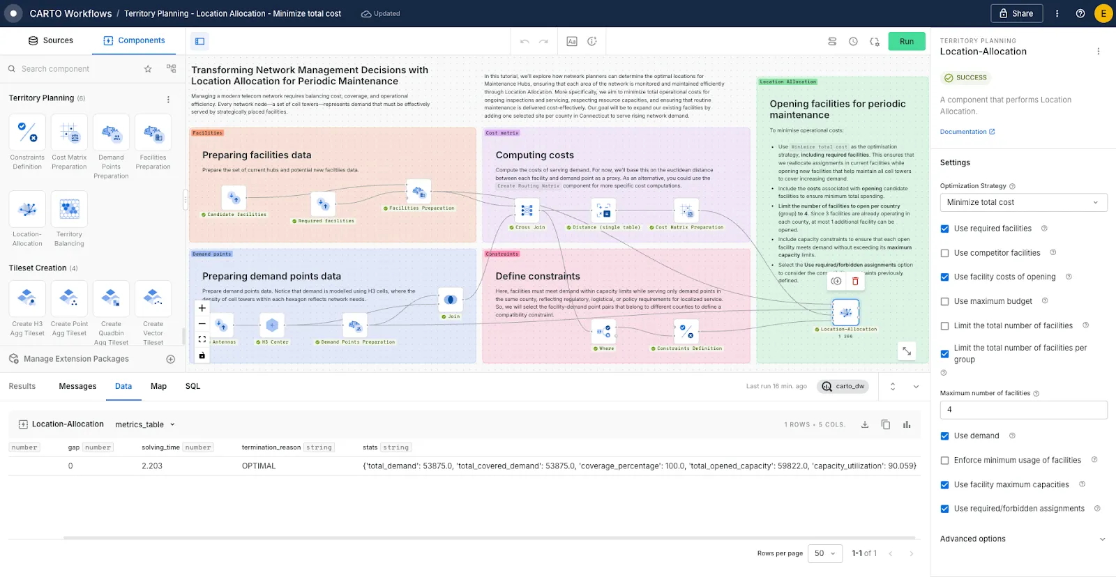 This package brings advanced Territory Balancing and Location Allocation capabilities to CARTO Workflows - our low-code tool for designing and automating spatial analysis. This makes it far easier to design, test, and optimize spatial strategies.