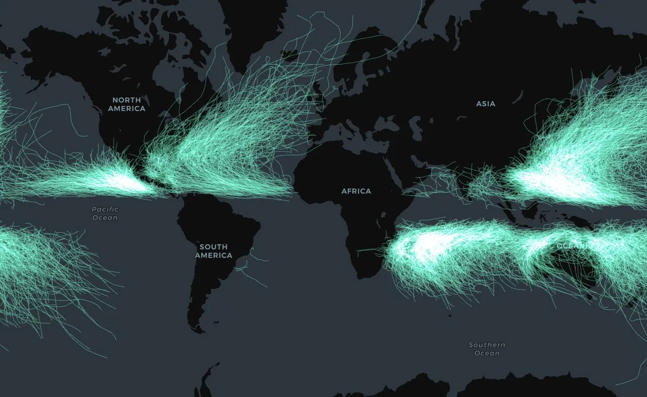 Open in full screen [here](https://clausa.app.carto.com/map/39ba8820-11ef-4391-89f0-fcfdd7b1546f).This is also a great method for constructing other “points-to-lines” geometries with multiple vertices. This edition of our LinkedIn newsletter shares how to do this, focusing on the more complex geometries of hurricane paths.