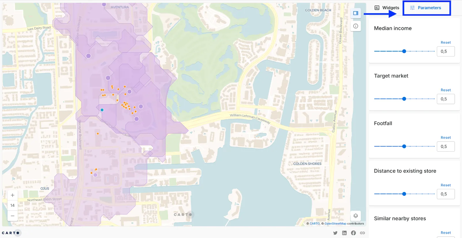 Each potential site receives a comprehensive score based on these variables. What’s unique is that you can customize these scores by assigning weights to each variable. This means that the end user can tailor the analysis to find the best sites for different product lines, marketing campaigns, or even specific seasonal offerings, making it an incredibly flexible tool for refining your expansion strategy. Open the map in full-screen here and try changing the Parameters to watch how it updates!