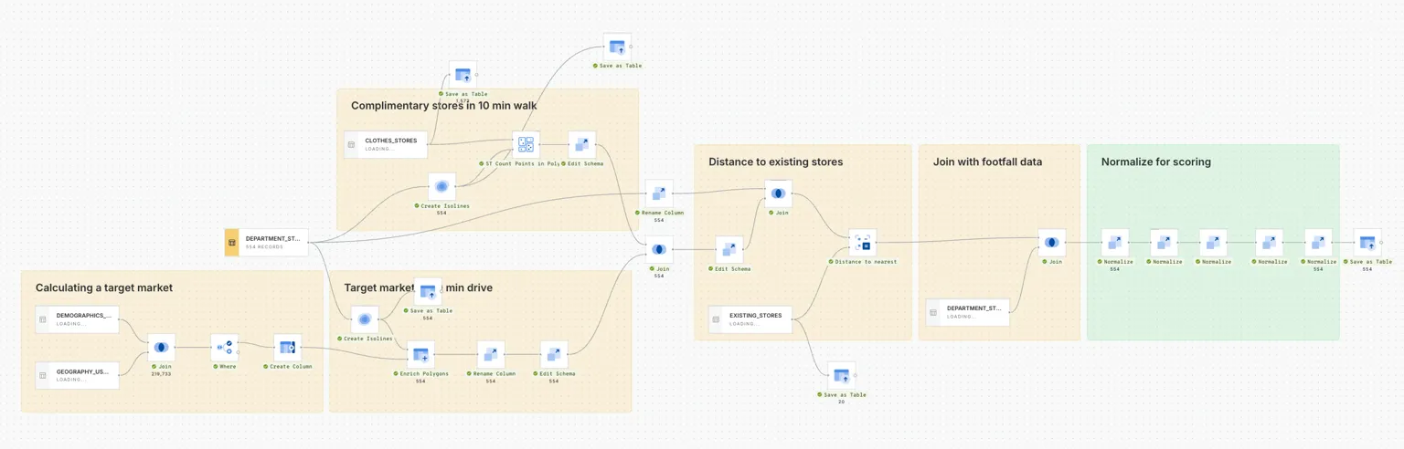 This interactive map was created through analysis built in CARTO Workflows - our low-code tool for automating complex spatial analysis - to seamlessly combine all these inputs (see below). We’re working with massive datasets including ACS demographic data, OpenStreetMap nodes, and various mobility data sources.