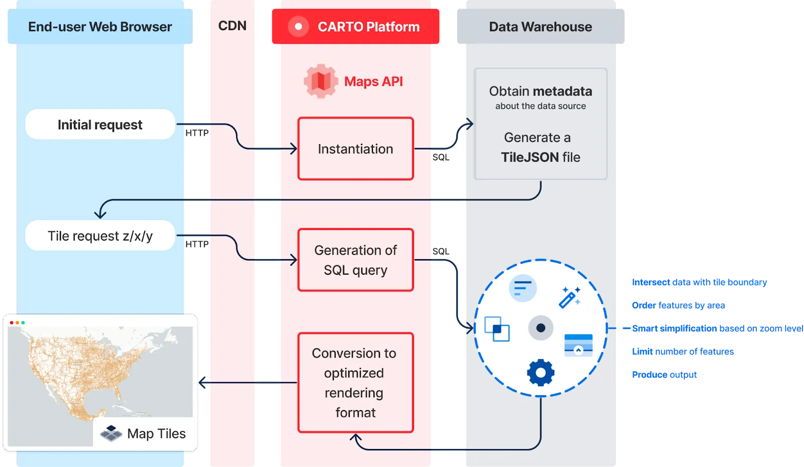As illustrated in the diagram below, after the initial request, CARTO will first instantiate the map, obtain metadata about the data sources, and generate a vector tileset end-point. Then, when the map is loaded in the user’s web browser, tiles start to get requested on demand progressively. At that point, CARTO generates highly optimized SQL queries in order to retrieve data from the cloud data warehouse, and finally encode it in a format that is suitable for rendering by the GPU.