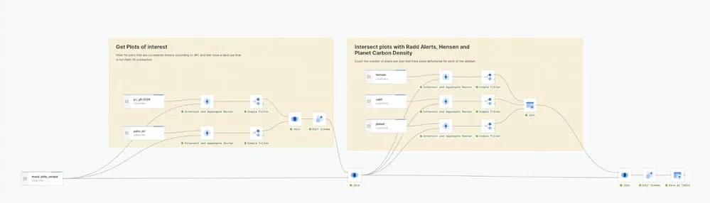 An example of our solution’s adaptability is showcased through LandGriffon, developed by our partner Vizzuality. LandGriffon provides a complete supply chain solution which extends its utility beyond EUDR compliance. By integrating this solution as a process into your data warehouse workflow, it becomes a versatile process from which other tools can harness the analysis and provide further spatial capabilities.