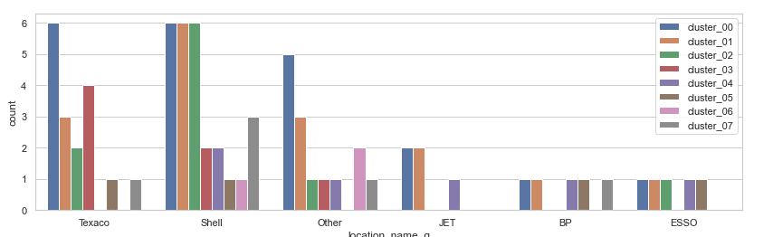 One question posed earlier was if this activity was dependent on petrol brand and if we plot clusters by brand we can see that the top brands have petrol stations in most clusters experiencing very different behaviors meaning there is little or no dependence.