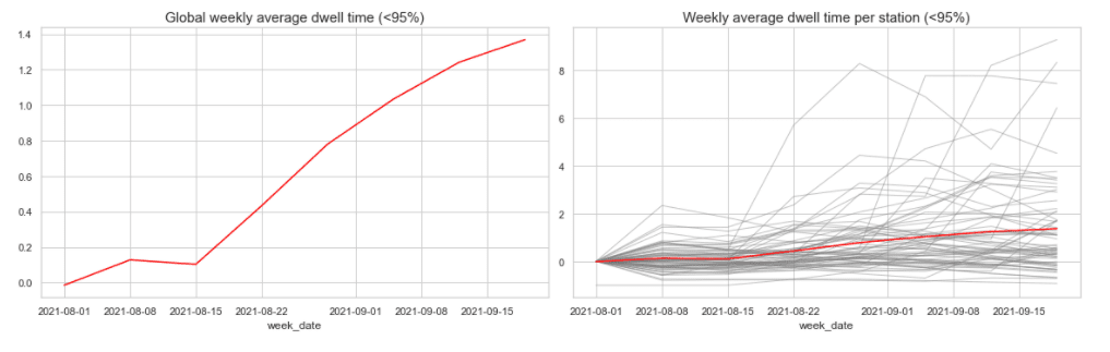 axs[1].set_title(‘Weekly average dwell time per station (<95%)’ fontsize=15)