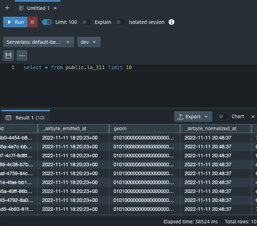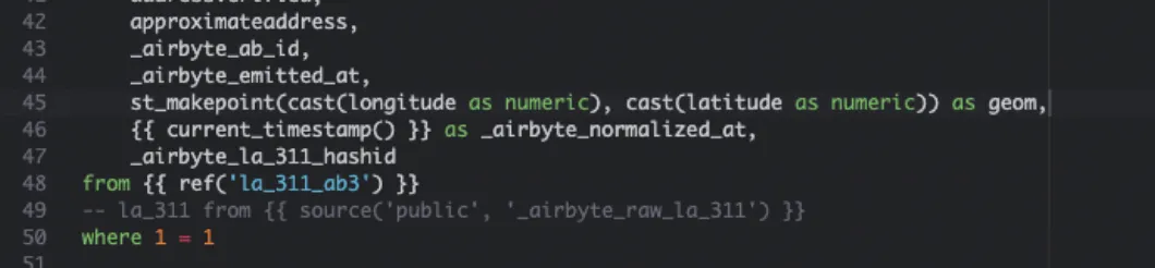 Let’s start with a simple transformation to create a geometry in our table. Open the SQL file located at ../models/airbyte_tables/public/la_311.sql. You should see the dbt generated SQL here. We are going to modify one line to create a geometry from the latitude and longitude columns. We need to cast the values to numeric within the ST_MakePoint function.