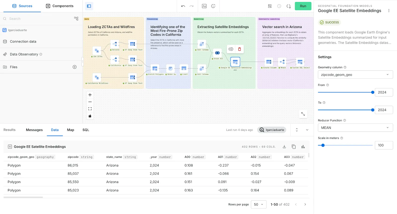 With this new component available in CARTO Workflows, you can load the embeddings directly into your data pipelines - no need to manually manage complex API requests or storage! For any chosen set of geometries and time range, the system retrieves the** summarized values** for each of the 64 embedding dimensions from Google Earth Engine.
