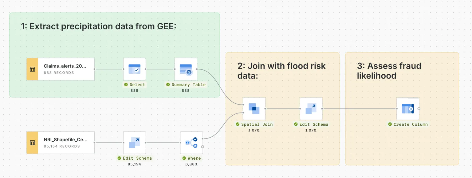 This analysis has been run by building the below pipeline in CARTO Workflows - our low-code tool for automating and productionizing spatial analysis. In this, insurance claims have been assessed in combination with FEMA flood risk scores and precipitation data from Google Earth Engine in order to rank claims from negligible to high fraud risk. You can watch this in action in our recent webinar!