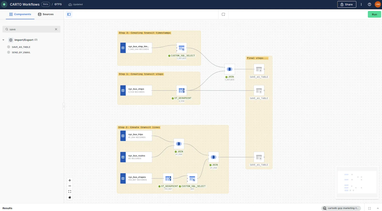 We’ll use the JOIN component to join the bus trips to the routes via route_id, and then again to our created trips shape via shape_id - and we’re done! You can also see in the screenshot above how you can preview the SQL driving your Workflow on the right of the screen.