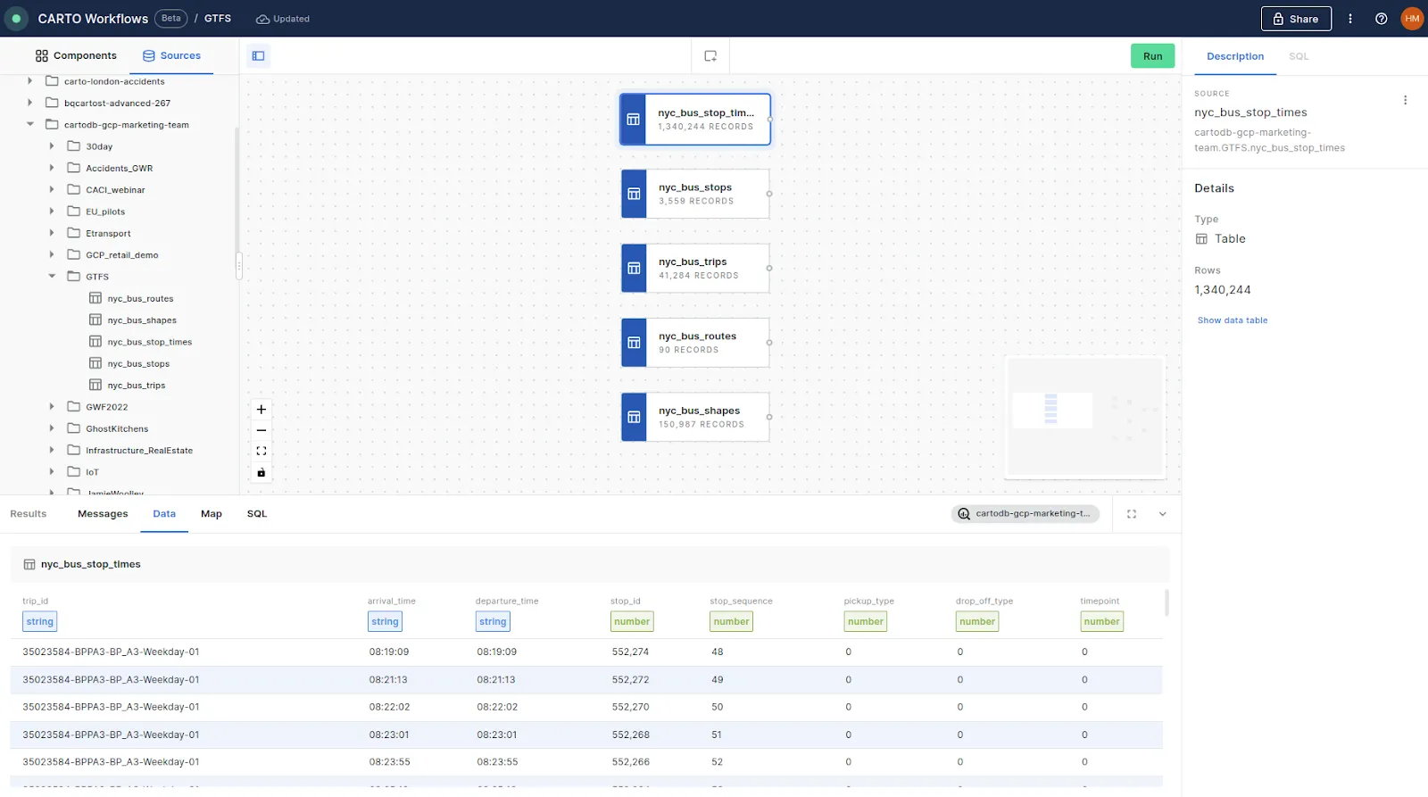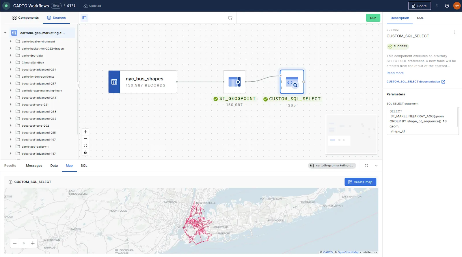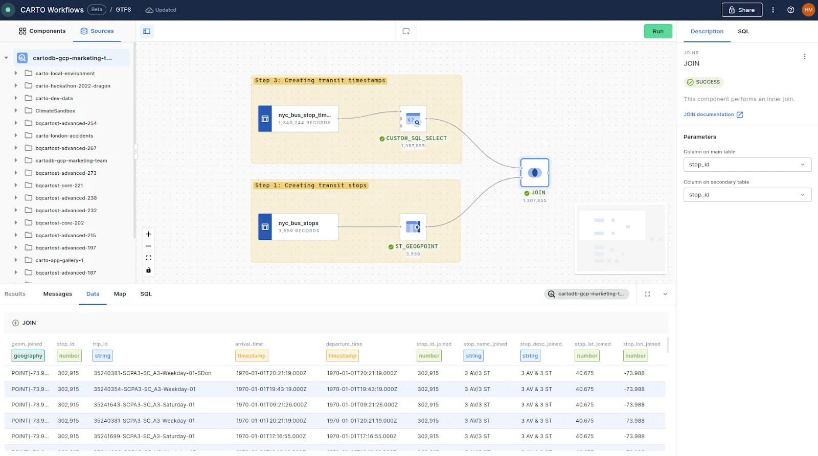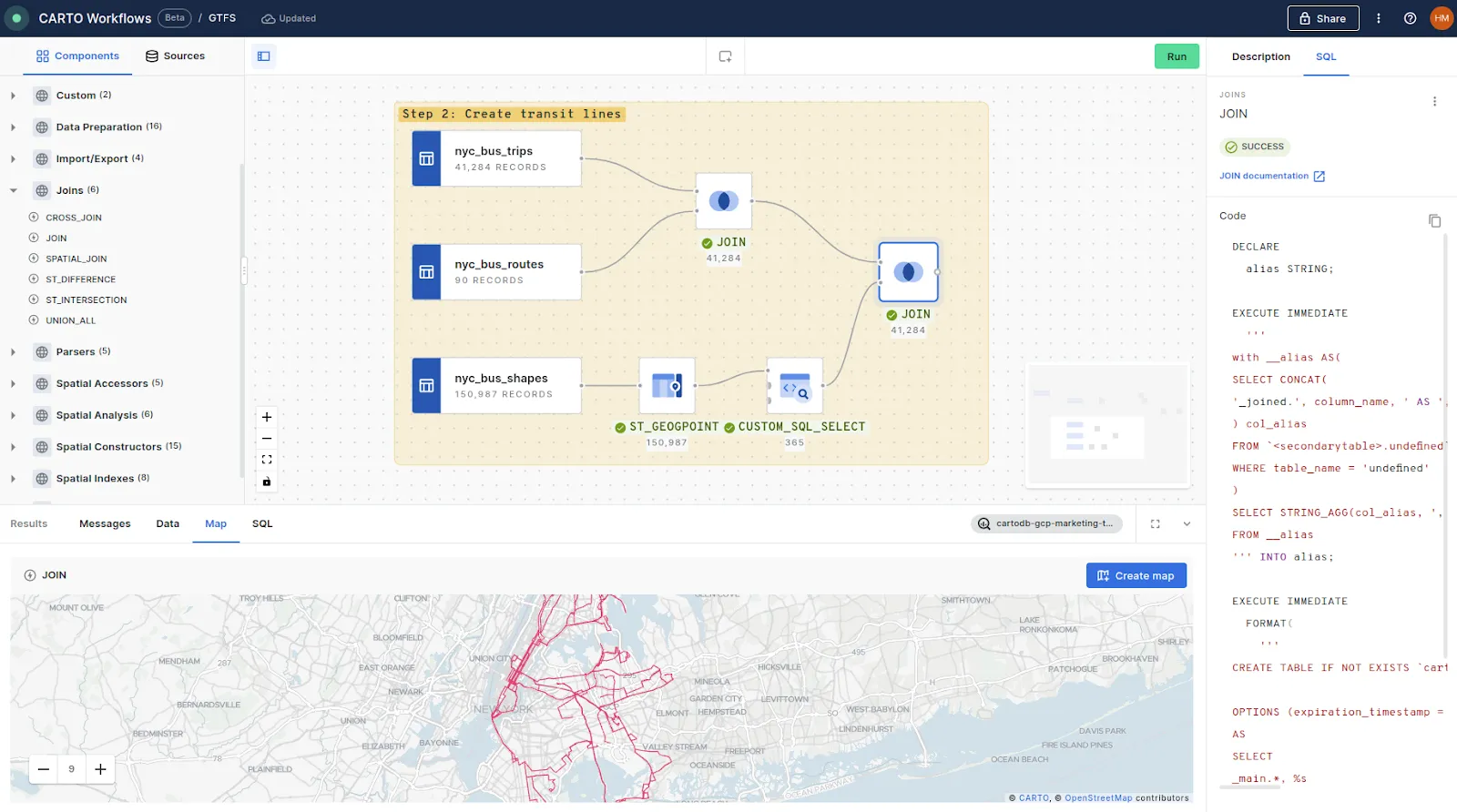 We’ll use the JOIN component to join the bus trips to the routes via route_id, and then again to our created trips shape via shape_id - and we’re done! You can also see in the screenshot above how you can preview the SQL driving your Workflow on the right of the screen.