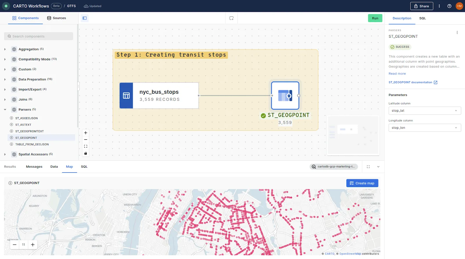 We’ll use the tool ST_GEOGPOINT for this, which you can find under the Parsers module or just by searching. This function takes a latitude and longitude column (stored in stops as stop_lat and stop_lon respectively) and creates a point geometry with them.