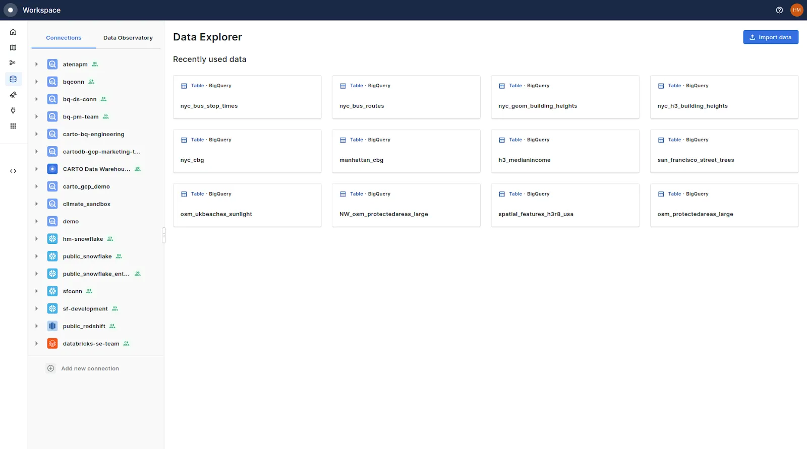 - Once you’re logged into CARTO at app.carto.com, navigate to the Data Explorer on the left hand panel- At the top right of the screen, you’ll see a button to import data. Click it!