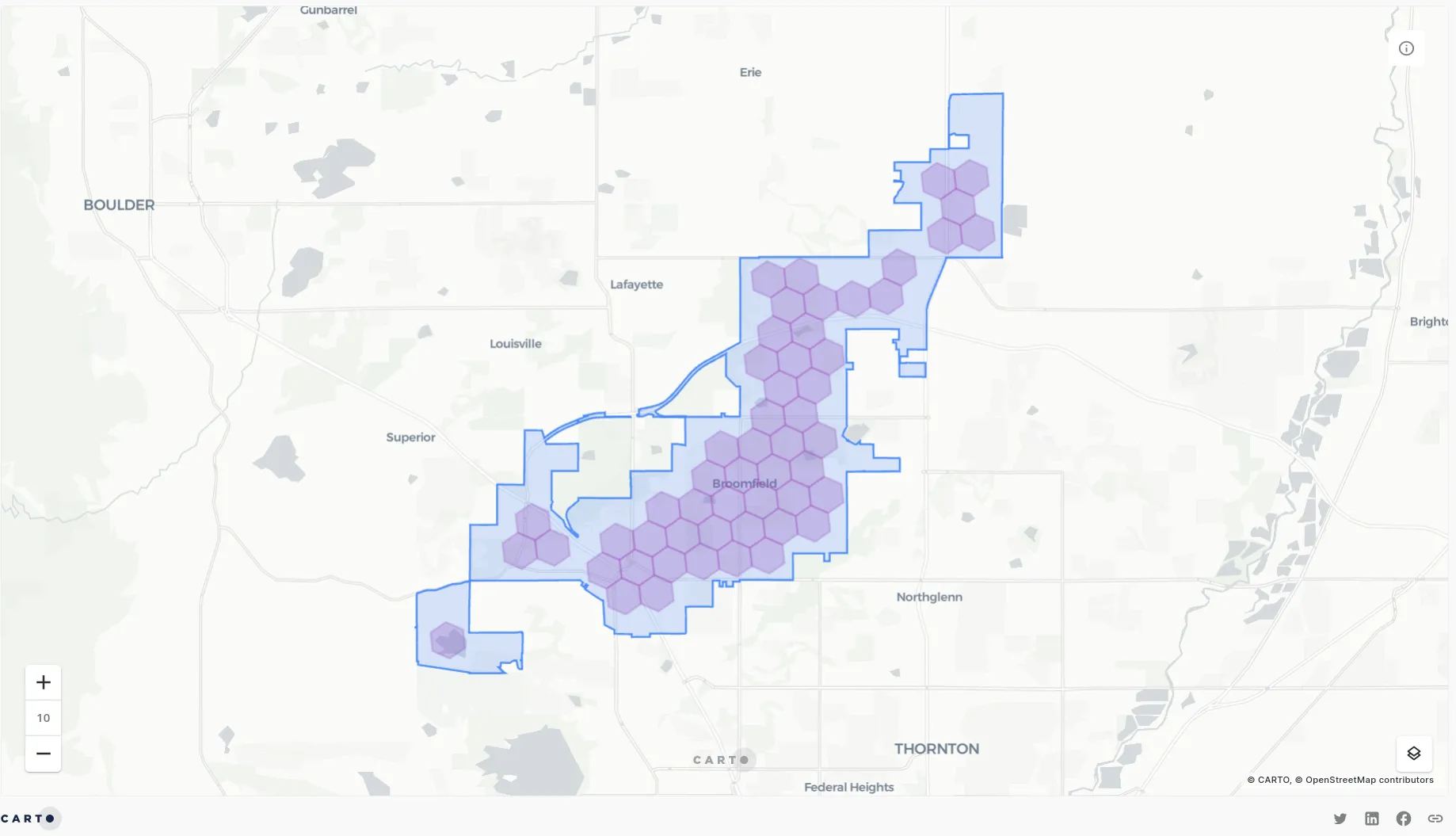 In the maps below we’ll be using Broomfield County Colorado (from Tiger/Line geographic data from the U.S. Census Bureau) to filter a H3 hexagon grid (made available through CARTO’s Spatial Features layers) to illustrate various spatial predicate concepts. You can subscribe to both of these datasets via our Spatial Data Catalog.