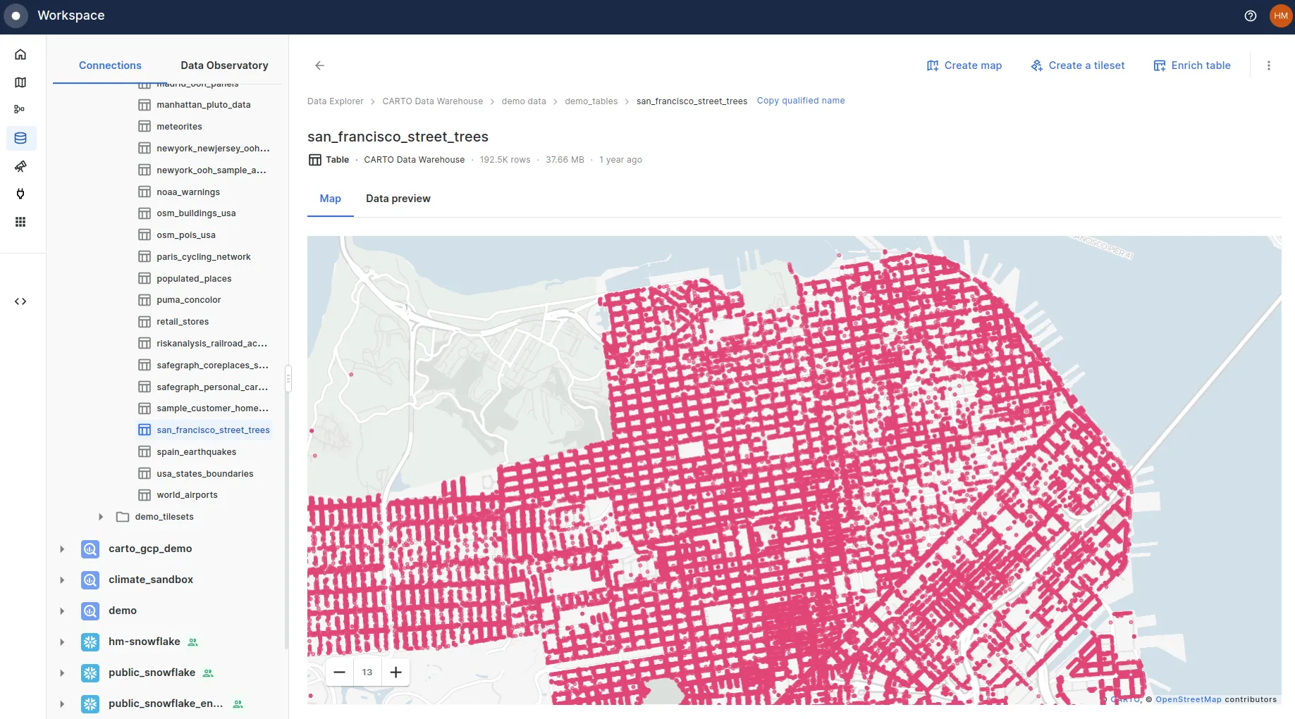 Our first step is to load our data. CARTO provides all users with the San Francisco street trees dataset as a demo dataset. When signed into your workspace, you can access this under Data Explorer > Connections > CARTO Data Warehouse > Demo data > Demo tables > san_francisco_street_trees.