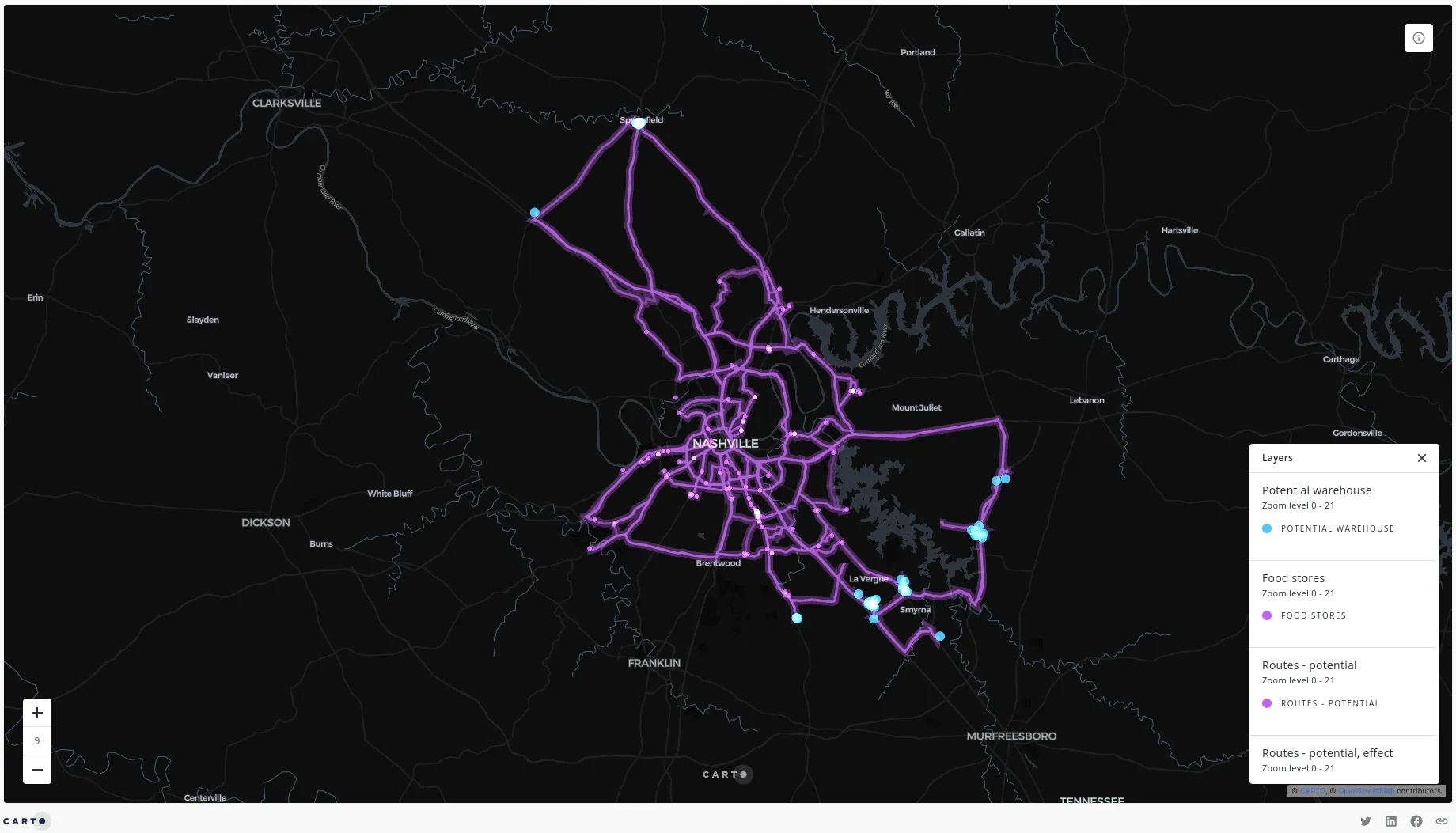 A really simple way of establishing this is just by calculating the total distance a vehicle would have to travel from each warehouse, to each merchant. As well as calculating this, we can also take advantage of some of CARTO Builder’s dynamic visualization tools to help us to understand this.