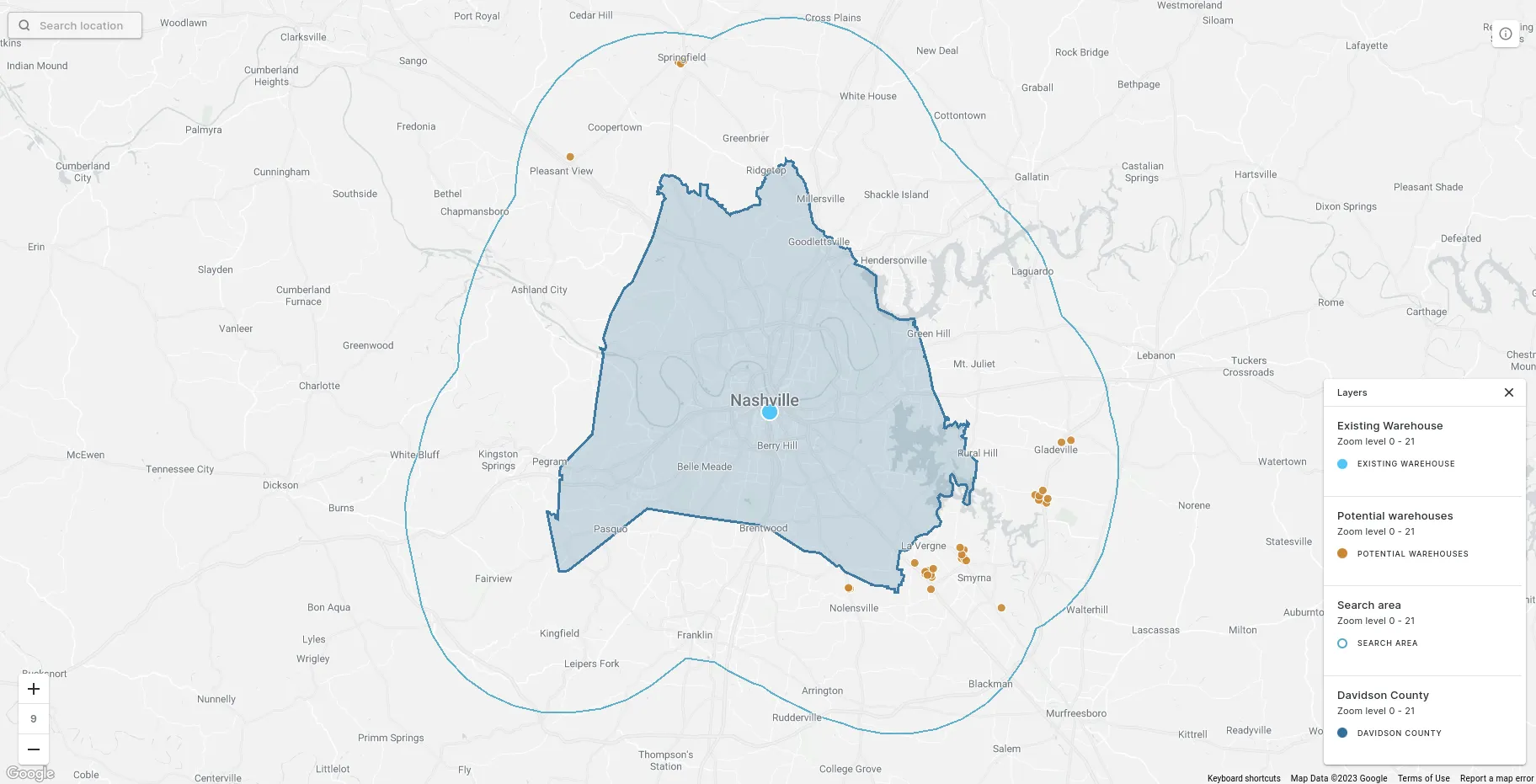 Warehouses within 10 miles of Davidson County, Tennessee.