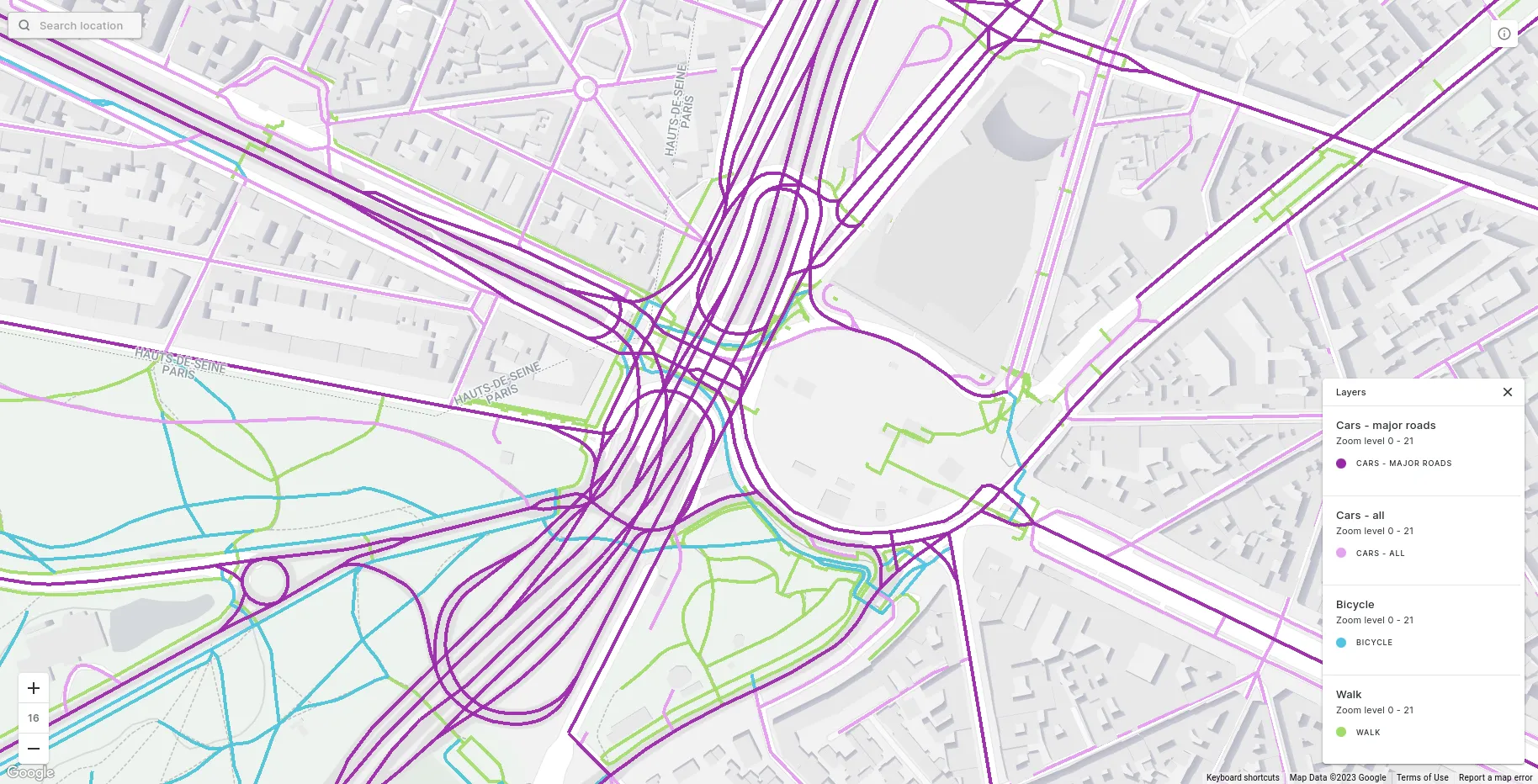 Some of the mode and street types available in the global road network. Av. de Neuilly - Pl. de la Porte Maillot, Paris.