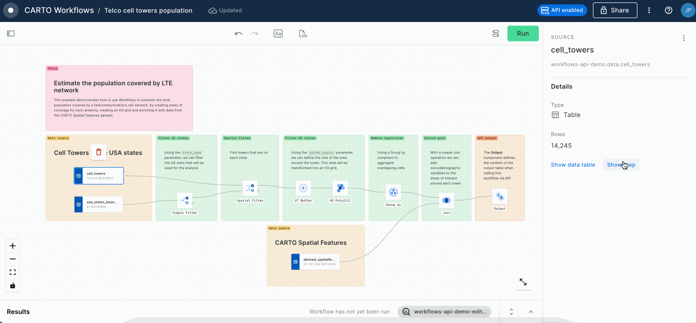 In order to illustrate these new features, we’ll be creating a workflow to analyze the population living in the areas around Telco LTE cell towers, in a specific US state. After that, we’ll integrate this analysis into an application by calling an API end-point for the specific workflow we have built. A very similar workflow to the one we are using in this story can be found as a template available in the CARTO Academy, which also includes a step by step guide to tackle a very similar use case.
