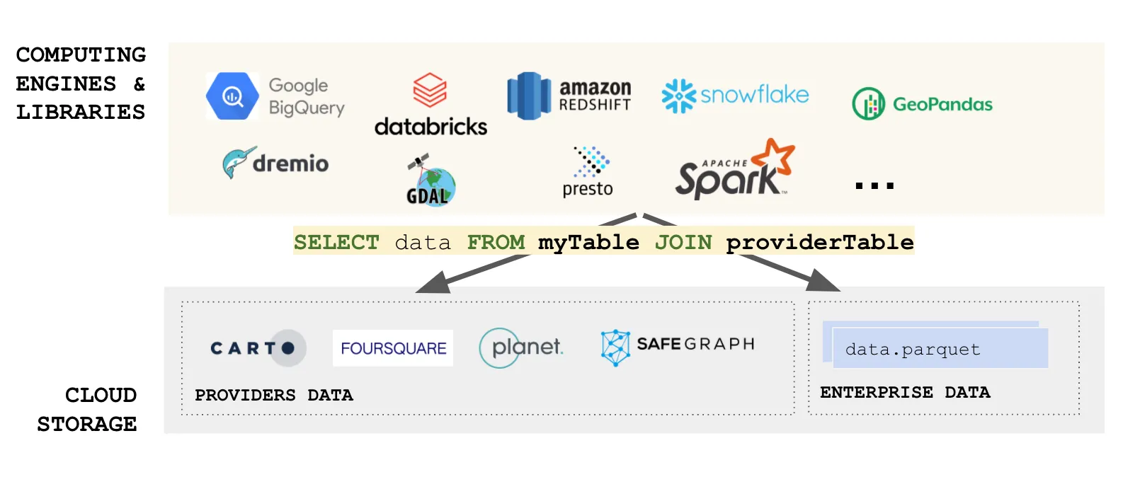 Today we are happy to introduce the first community proposal for GeoParquet. Our goal is to standardize the storage of geospatial vector data in Parquet, a very popular columnar storage format for tabular data. The vision is to enable interoperability between different cloud data warehouses and computing engines when using geospatial data. The so-called Data Cloud is one of the fastest growing enterprise software segments, and is enabling a huge influx of new users to the analytics field. With this initiative we are looking to unlock spatial analytics for this fast-growing user community.
