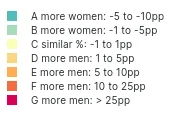 Yellow areas show where there is less than 1 percentage point (pp) difference between the men and women accessing a service. Redder areas show where more men access the services and greener areas show where more women do.
