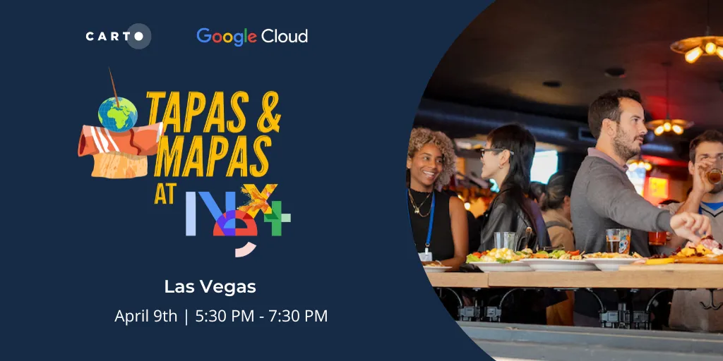 After the first day of Google Next, we’re delighted to invite you to Tapas & Mapas at Hazel Coffee & Cocktails. This event is for leaders (in any industry) curious about exploring the possibilities unlocked by spatial data analytics with Google BigQuery and CARTO. It’s the perfect setting to network and exchange ideas about all things Spatial!