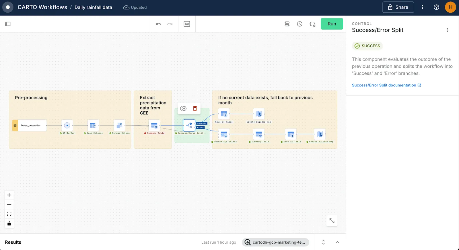 This workflow is monitoring rainfall levels for a series of 10,000 properties across Texas via the Google Earth Engine CARTO Workflows Extension Package. The initial Summary Table component attempts to find the average rainfall for the current date. If this process fails, a** Success/Error Split** component (highlighted in green) routes the analysis through a different Summary Table component which calculates the average rainfall for the previous month. In both branches, the results are added to the CARTO Builder map below (open in full-screen here).