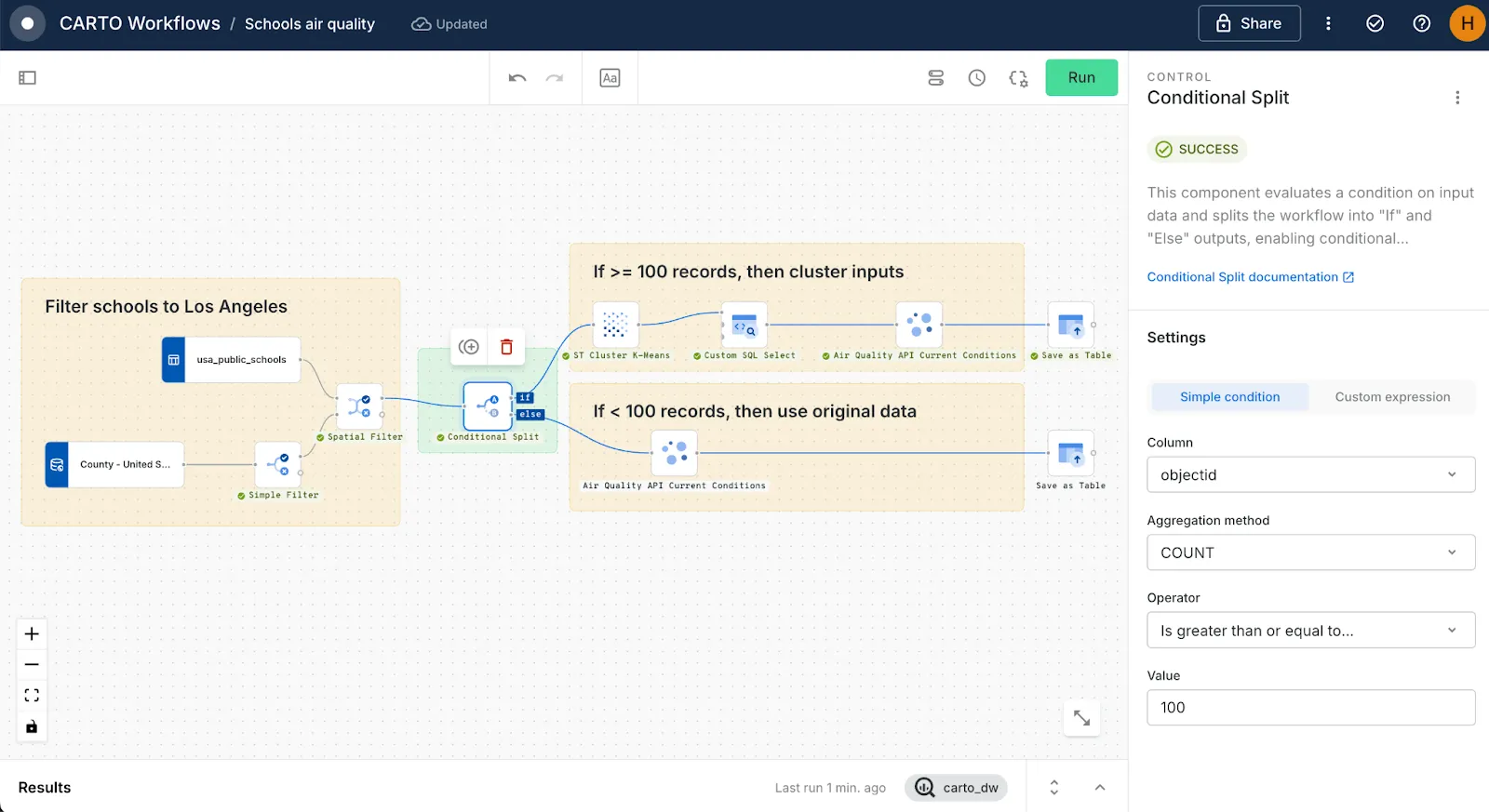 This workflow is monitoring real-time air quality for schools across Los Angeles using the Google Environment APIs CARTO Workflows Extension Package. To ensure this analysis does not exceed the Air Quality API Current Conditions quota of 1,000 calls per project, a** Conditional Split** is applied: