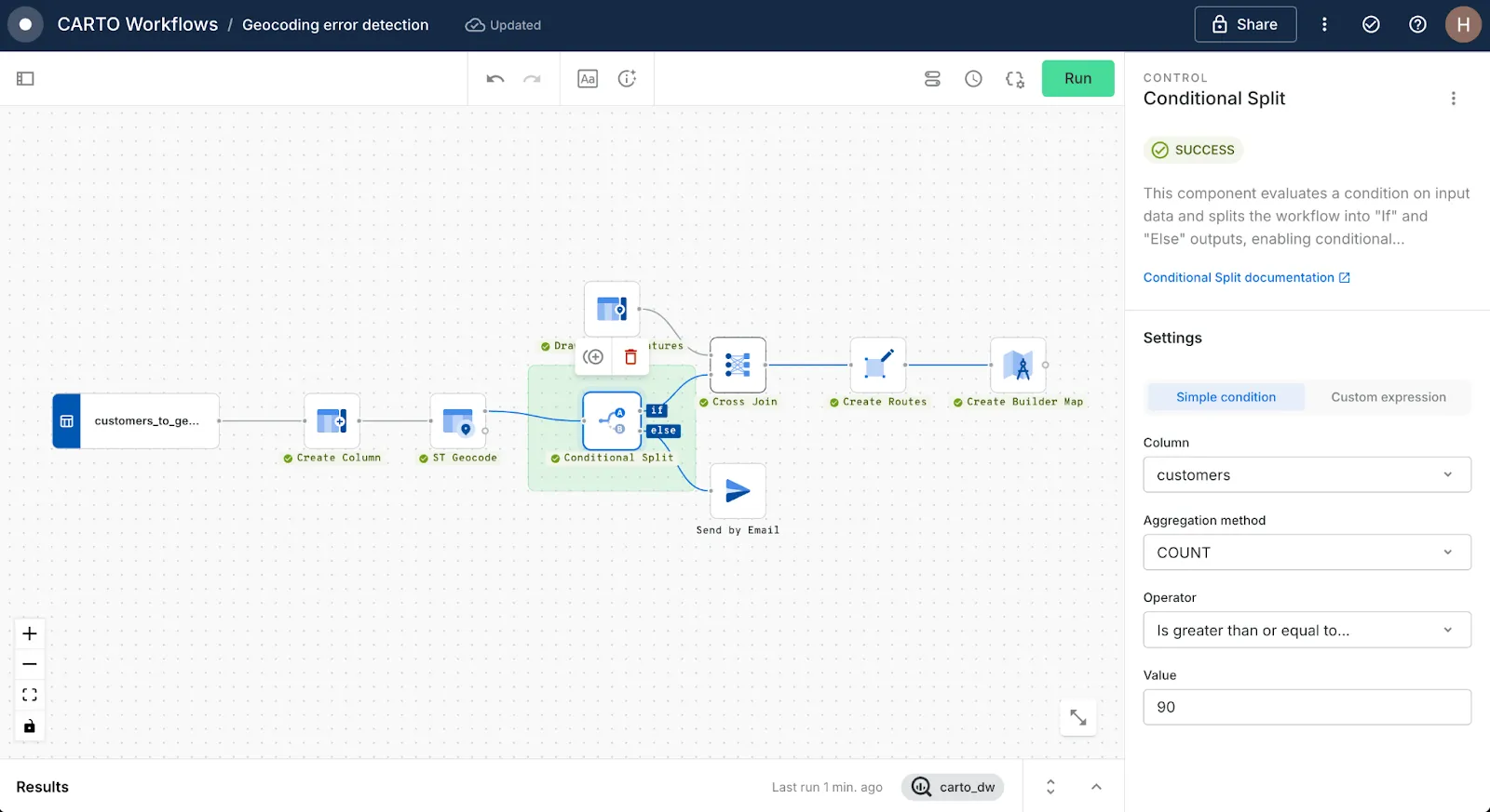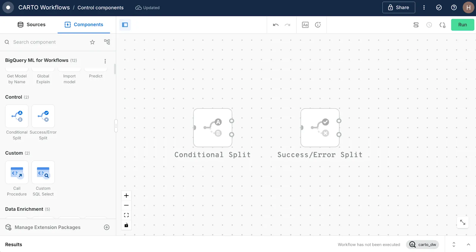 That’s why we’ve added two new control components to CARTO Workflows, our low-code tool for automating spatial analysis pipelines, right in your cloud data warehouse. The new Conditional SplitandSuccess / Error Splitcomponents give you the flexibility to route data or actions dynamically, handle errors without manual intervention, and keep your processes clean and resilient.