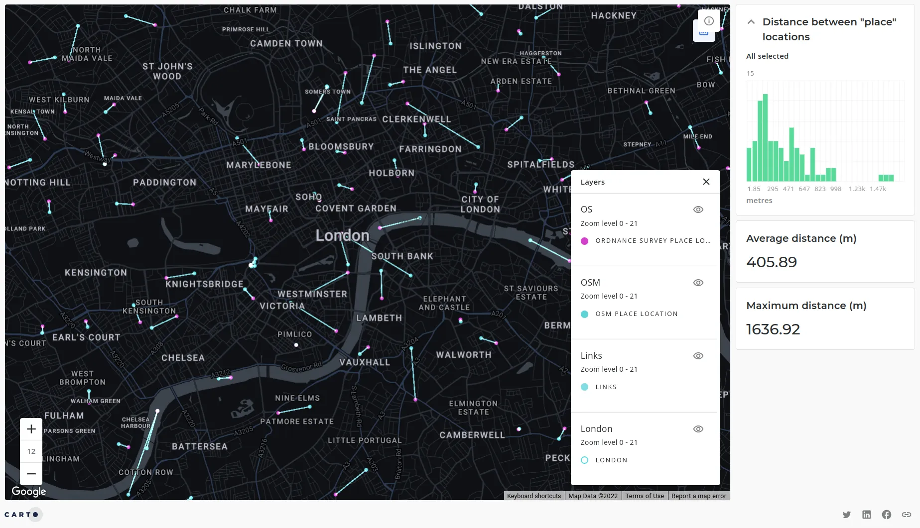This is illustrated in the above map (explore the interactive version here) which depicts the differences between place name locations in London UK sourced from OpenStreetMap (blue) compared with Ordnance Survey (pink) - the UK’s national mapping agency.