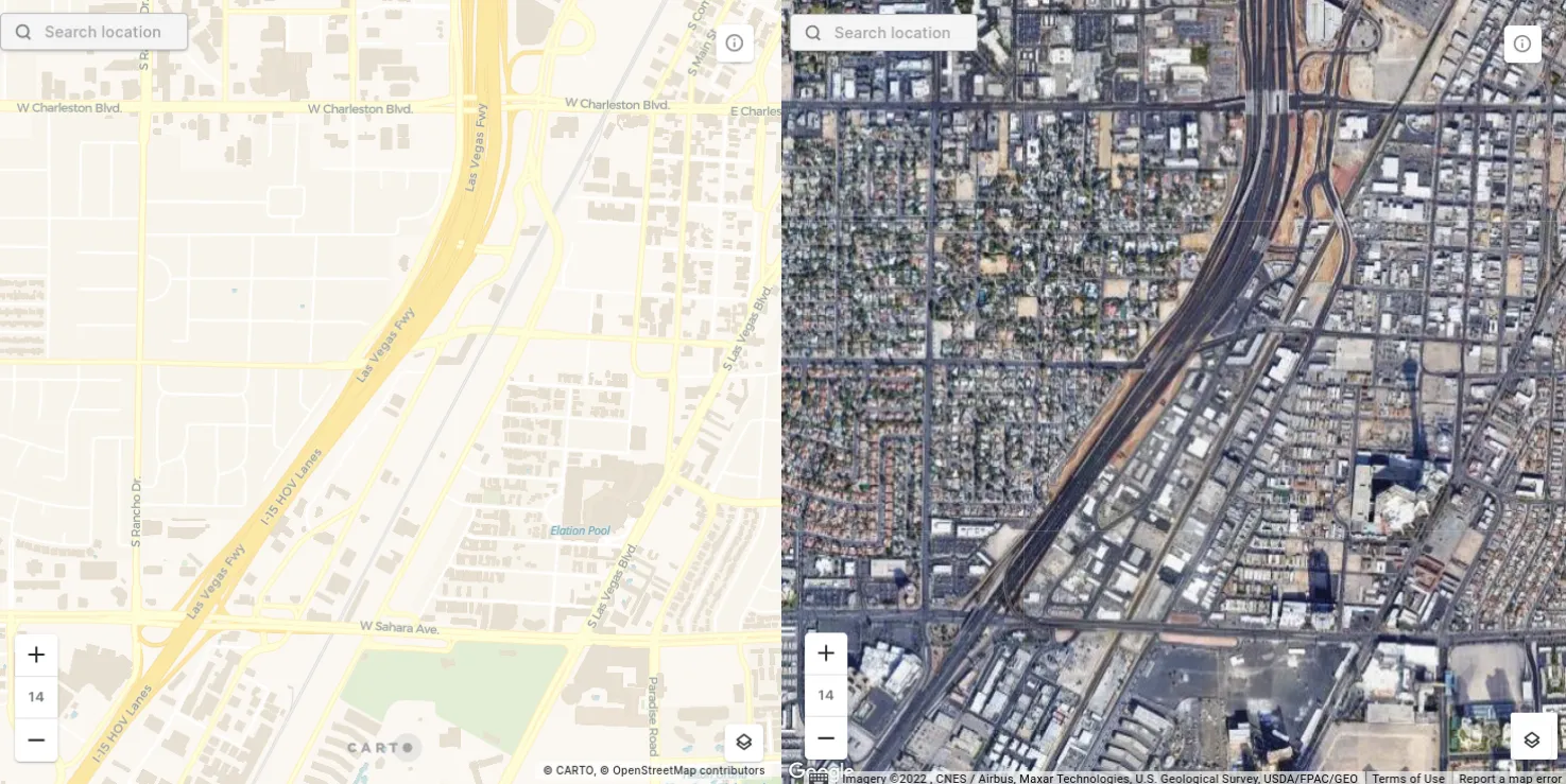 **Completeness.**Due to the nature of being a crowd-sourced dataset, the completeness of OSM can be uneven. Typically, suburban and rural areas are less complete than city centers (see below, South Las Vegas). Similarly certain data categories can be less complete - highways are typically fairly prevalent, for example, whereas buildings are less complete.