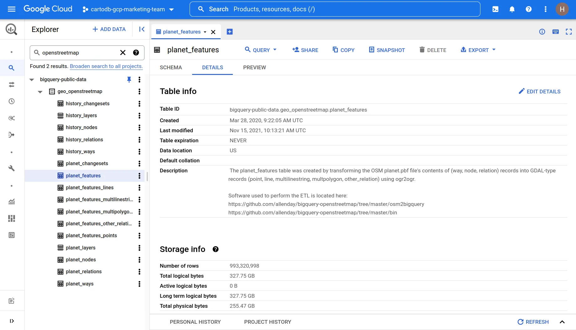 The Google BigQuery Console showing details about the OSM Planet Feature table.