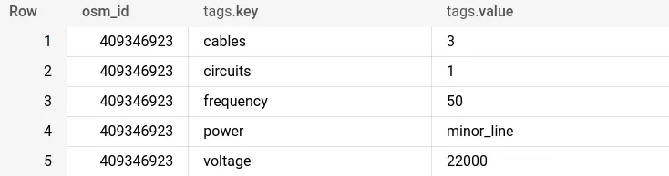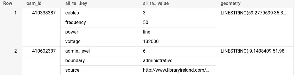 The first two records in the OSM planet features table.This illustrates how the key-value pairing system works with keys and values nested within an all_tags column. To be able to effectively analyze this data - as well as use it in a geospatial context - we need tounnest it into a flattened table using the below syntax.