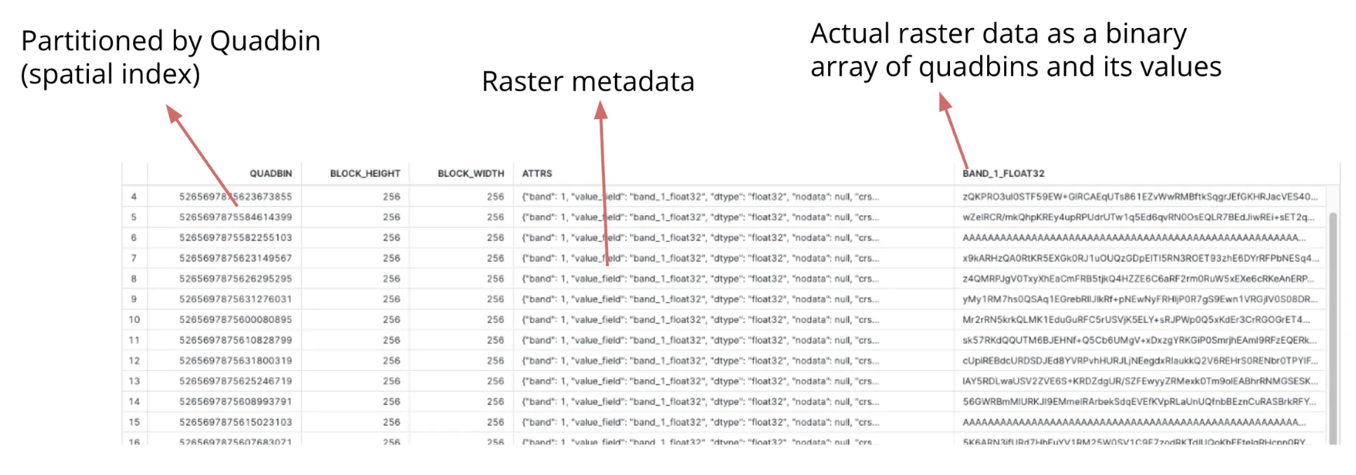 CARTO has developed a way to store and manage rasters as tables so users can query them both using SQL and our no-code tool CARTO Workflows. Here’s how it works! Raster data is partitioned by Quadbin grid; a type of data known as a Spatial Index. In this format, location is encoded through a short reference ID, enabling highly performant storage of big data. The actual raster data itself is stored as a binary array of Quadbins, each containing the raster values. This means the performance of spatial queries on the raster data is significantly improved. Alongside the indexed structure, each raster includes essential metadata detailing the specifics of the raster file, such as its origin, resolution, and format. This structure ensures that all necessary information is readily accessible.