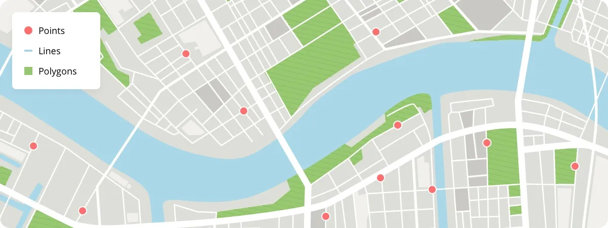 - Points - single vertex, e.g. a house.- Lines - two or more vertices where the first and last vertex are not equal, e.g. a road.- Polygons - three or more vertices with the last vertex equal to the first, e.g. a boundary.