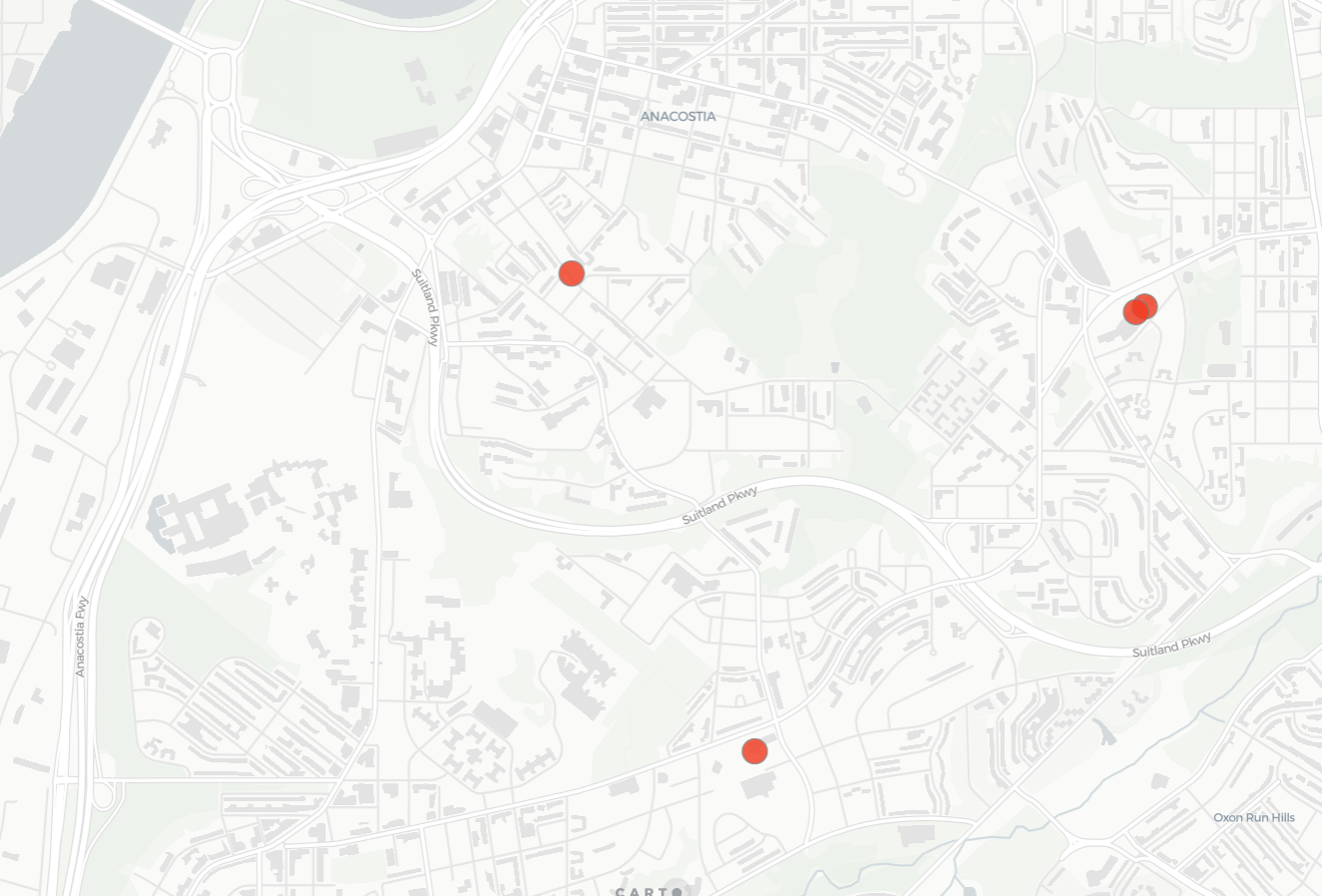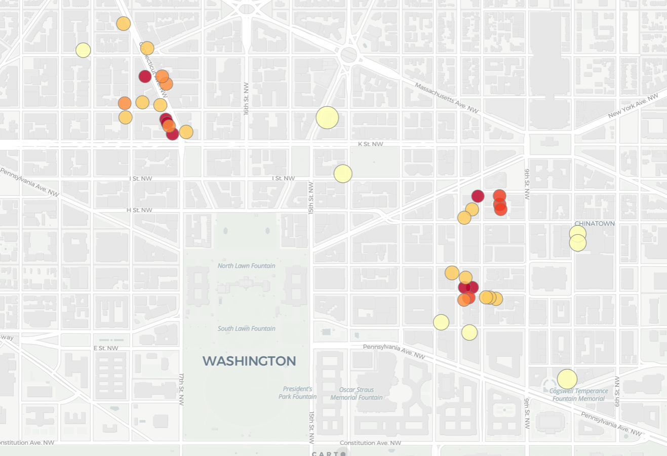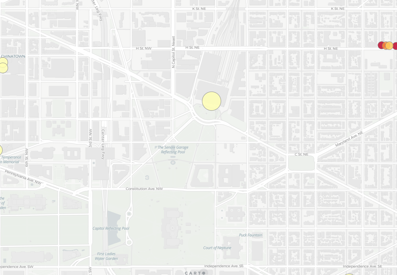 As mentioned earlier clothing stores could be expected to exhibit clear spatial clustering. When enough stores form together a shopping destination is formed. For this example let’s take a look at Washington D.C. According to OpenStreetMap (available directly via CARTO’s Data Observatory here) there are 168 clothing stores in Washington D.C. as well as numerous others in neighboring areas such as Bethesda and Alexandria.