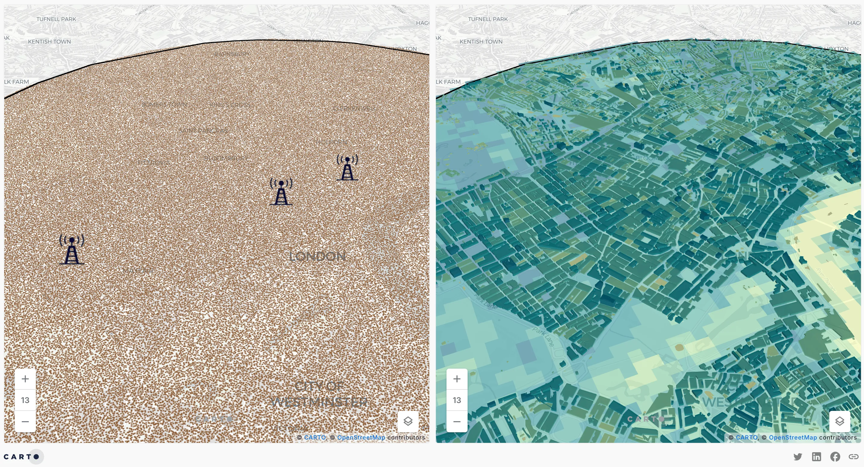 [](https://clausa.app.carto.com/map/203331ce-678f-4d9c-8b95-55b2f91c4bdd) As we can see from the interactive map, the model reveals a valley area right below the tower location, where the signal is significantly attenuated. Moreover, the map highlights how the path loss exhibits a non-isotropic pattern, being primarily influenced by the presence of buildings, which heavily impact signal propagation in urban-dense areas. These insights could be used to inform decisions to improve coverage by including additional infrastructure or adjusting the tower's power output.Take the Next Step: Try It Yourself!