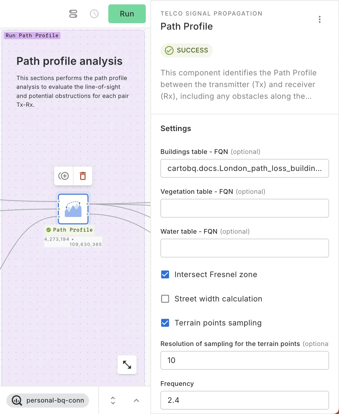 [](https://clausa.app.carto.com/map/7c386236-cf49-4b1e-a0c2-45353054a1fe) ### Step 2: Running Line-of-Sight analysisThe next step in the analysis is to use the Path Profile component to evaluate which areas have direct visibility to the signal source. The tool calculates whether the terrain or buildings obstruct the line of sight, ensuring you can identify zones with strong signal reliability. This component expects three mandatory inputs: