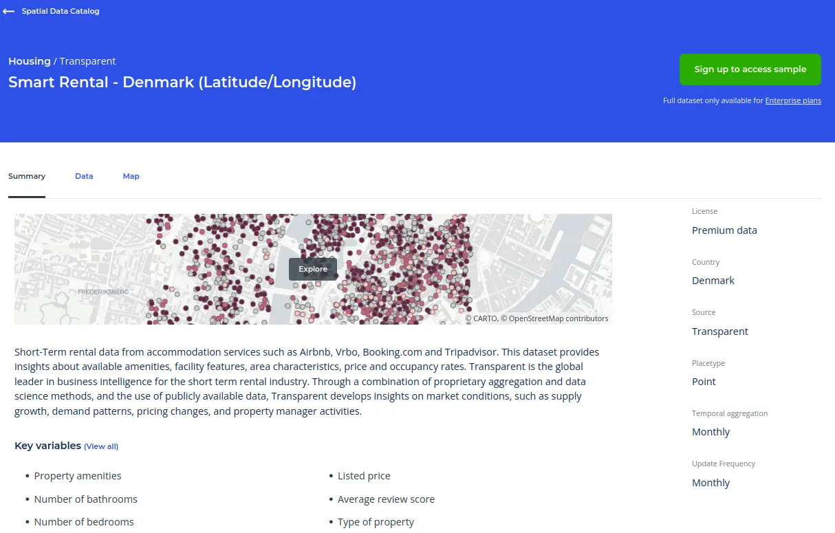 Firstly, you’ll need the vacation rental properties data from Transparent. You can request a subscription of this data for any country in the world from our Spatial Data Catalog; in this case, we’re looking at Denmark.