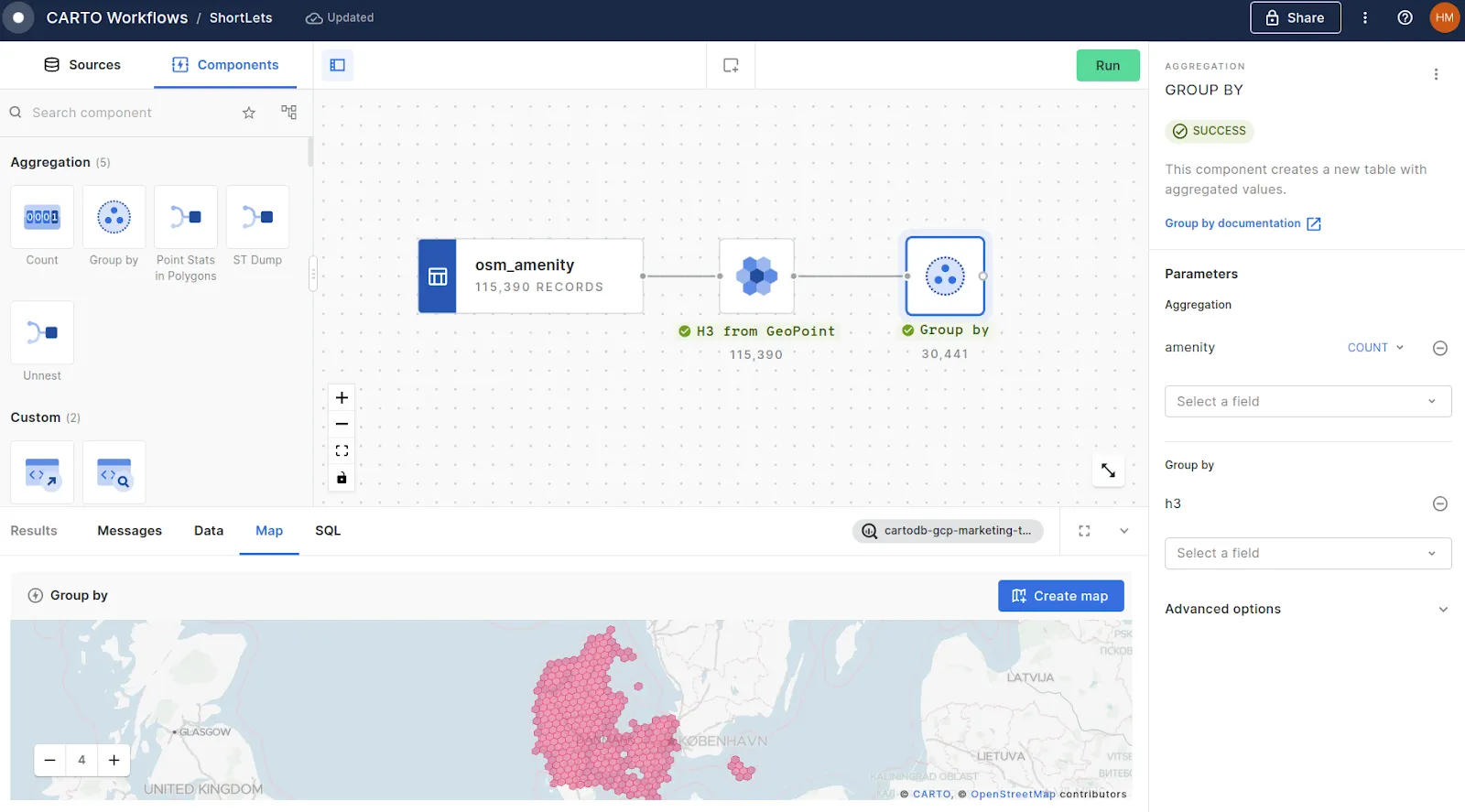 - Connect your OSM layer (here we’re looking at amenities) to a H3 from GeoPoint component, to create a H3 cell for each of the ~115k input points - we’ve used a resolution of 9. Run your workflow (note you can do this at any stage of this process).- This will create some duplicate H3 cells where multiple amenities fall inside that cell - we can use this duplication to count our inputs. Connect H3 from Geopoint to a Group by component, setting theaggregation parameter to amenity - count (this can be any column from your input table) and theGroup by field to H3. This step should then be repeated for tourist attractions, and the vacation rentals themselves.