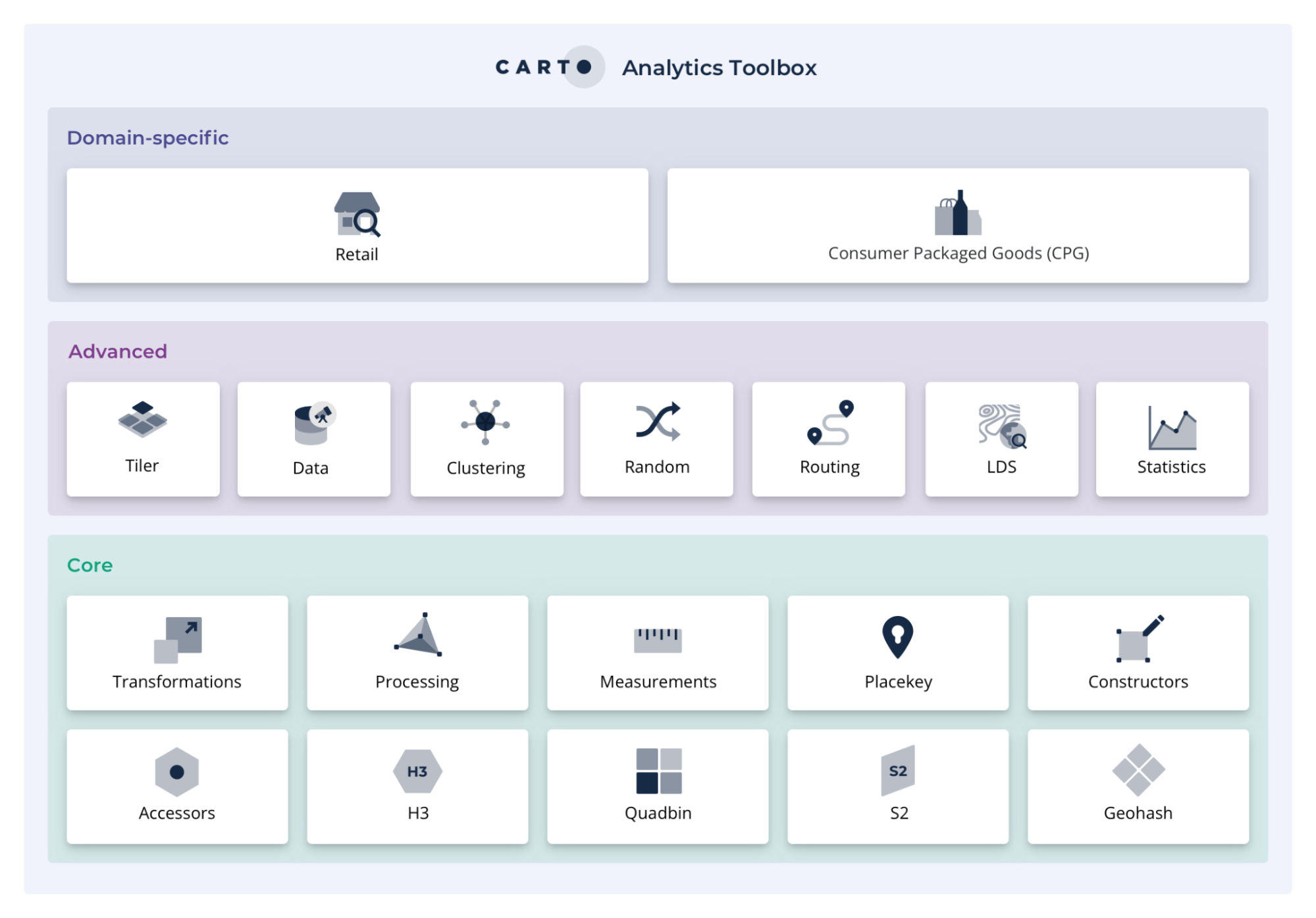 These analytical functions are currently available for Google BigQuery, and can be executed directly from CARTO for CPG or the cloud console itself ,using simple spatial SQL commands.