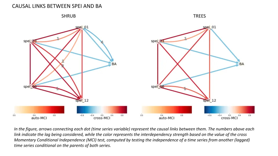 For selecting the most relevant precursors among meteorological variables which are temporally-dependent we used an approach called Causal Discovery Analysis which detects as many true causal relationships as possible between time series (including their temporal lags) and controls the number of incorrect link detections. For the SPEI 1 3 6 and 12 months were considered; and for the soil moisture , depths of 0.00, 0.01, 0.04, 0.10, 0.30, 0.60, 1.00, 1.60 and 3.00 meters were included. The results of the analysis (see figure below) show that significant negative relationships between the seasonal SPEI and BA time series were found although different accumulation time and lags are selected for each cluster.