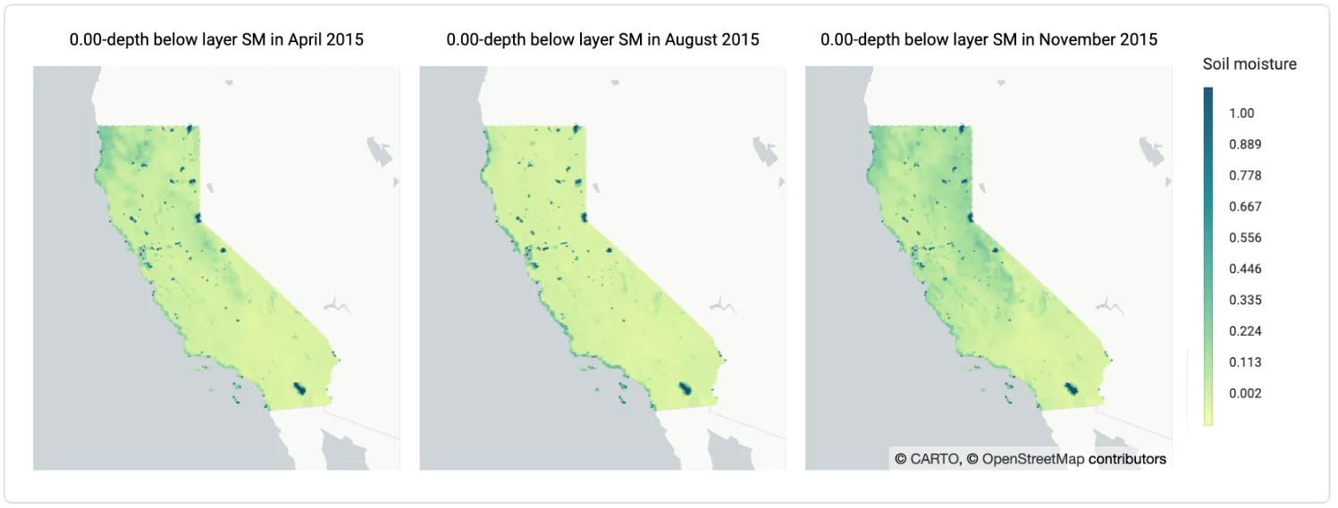 On the other hand, if we use the seasonal WRI to focus on fires occurring during Summer, we can see that many fires occur in VH risk-labeled areas. As noted above 2020 was a particularly bad season for California fires with an unprecedented fire occurrence and severity. This is well reflected by the constructed risk index that when compared to the same season in previous years, shows a high to very-high risk in most of the region. If we select other seasons in the previous map, we can see that for 2020 colder seasons (Winter and Spring) it shows lower risk than previous years, whereas during hot drier seasons (Summer and Fall) the risk of wildfires increases significantly. It is also noticeable that the WRI in Fall appears to be VH in most cases. This occurs because during these months the forecasted 2020 SPEI values are much lower than those used to define the index (2001-2019) indicating that the 2020 Fall season is much drier than average explaining the elevated risk of ignition as can be also seen in these figures: