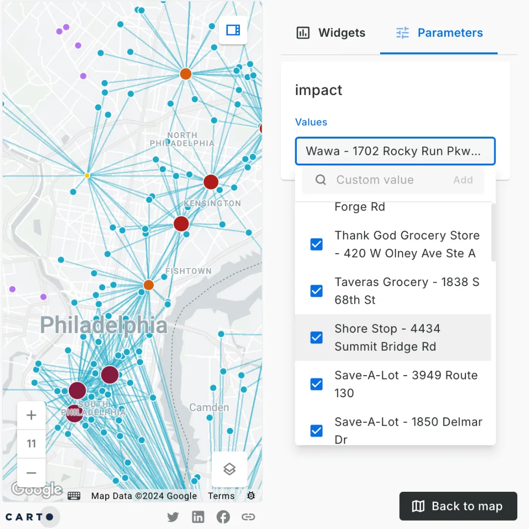 [](https://clausa.app.carto.com/map/fff95539-780f-46a1-956a-a485f119d215) ### Creating and using SQL parametersThis dashboard utilizes three parameters: